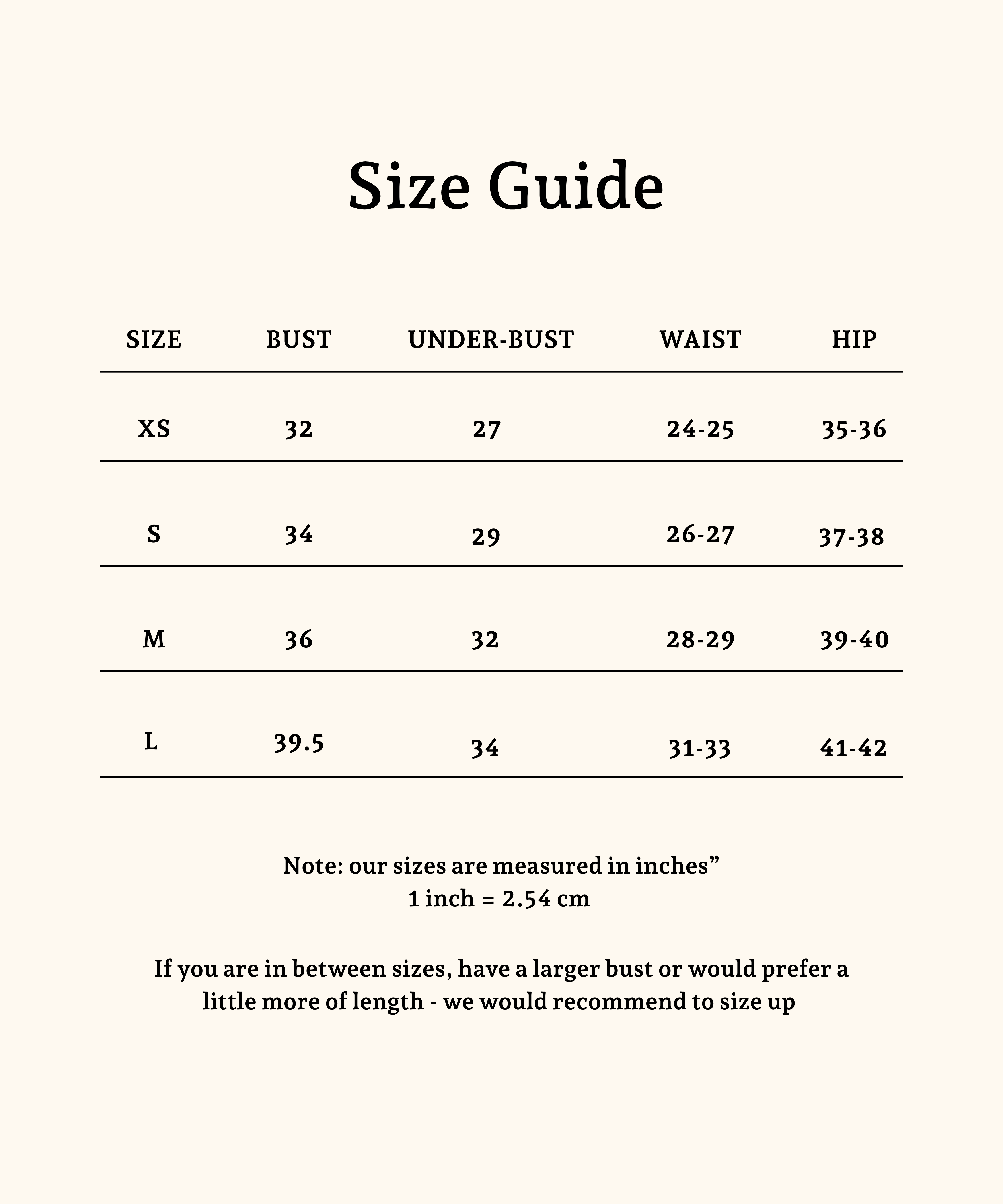 - Processing: Items must be returned to our studio before an exchange or refund can be issued. Exchanges depend on the availability of garments at the time of processing.