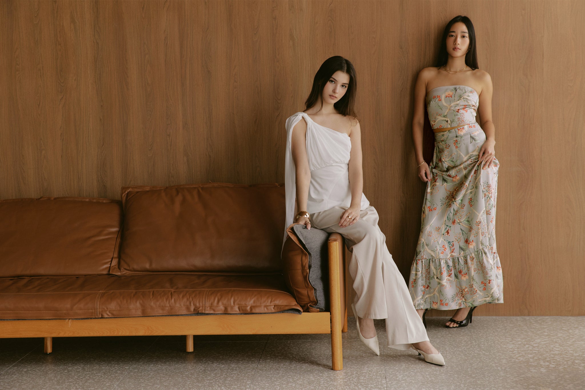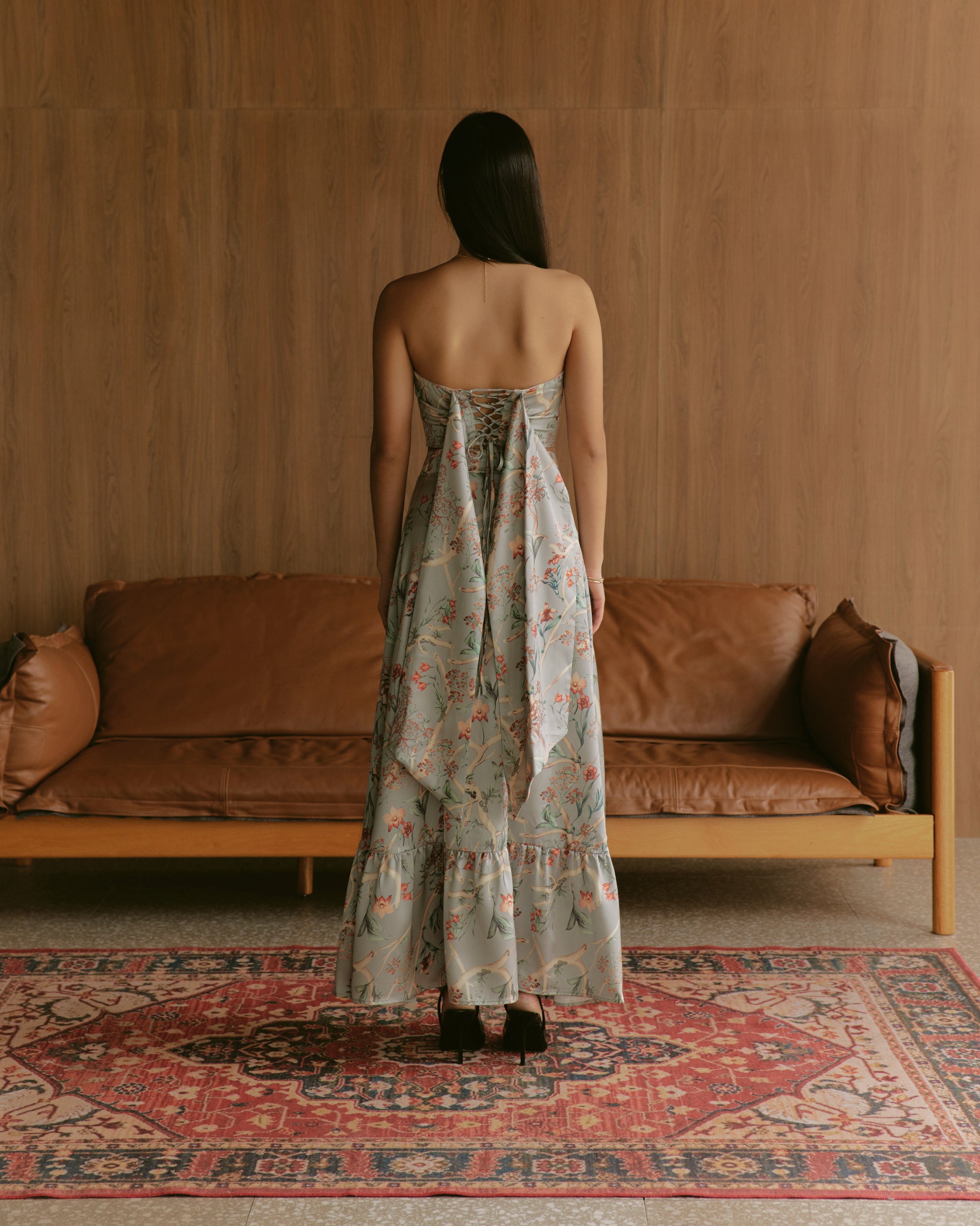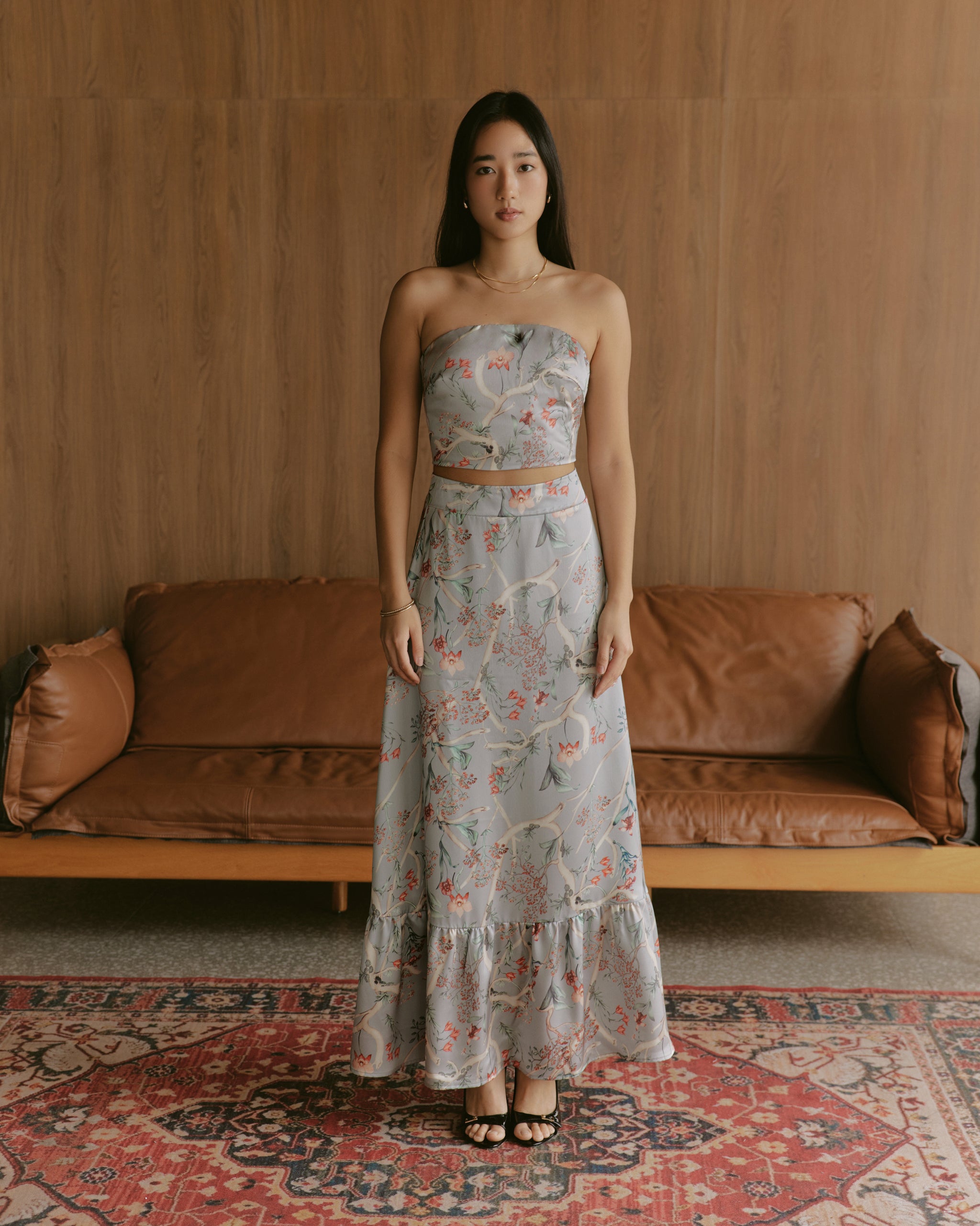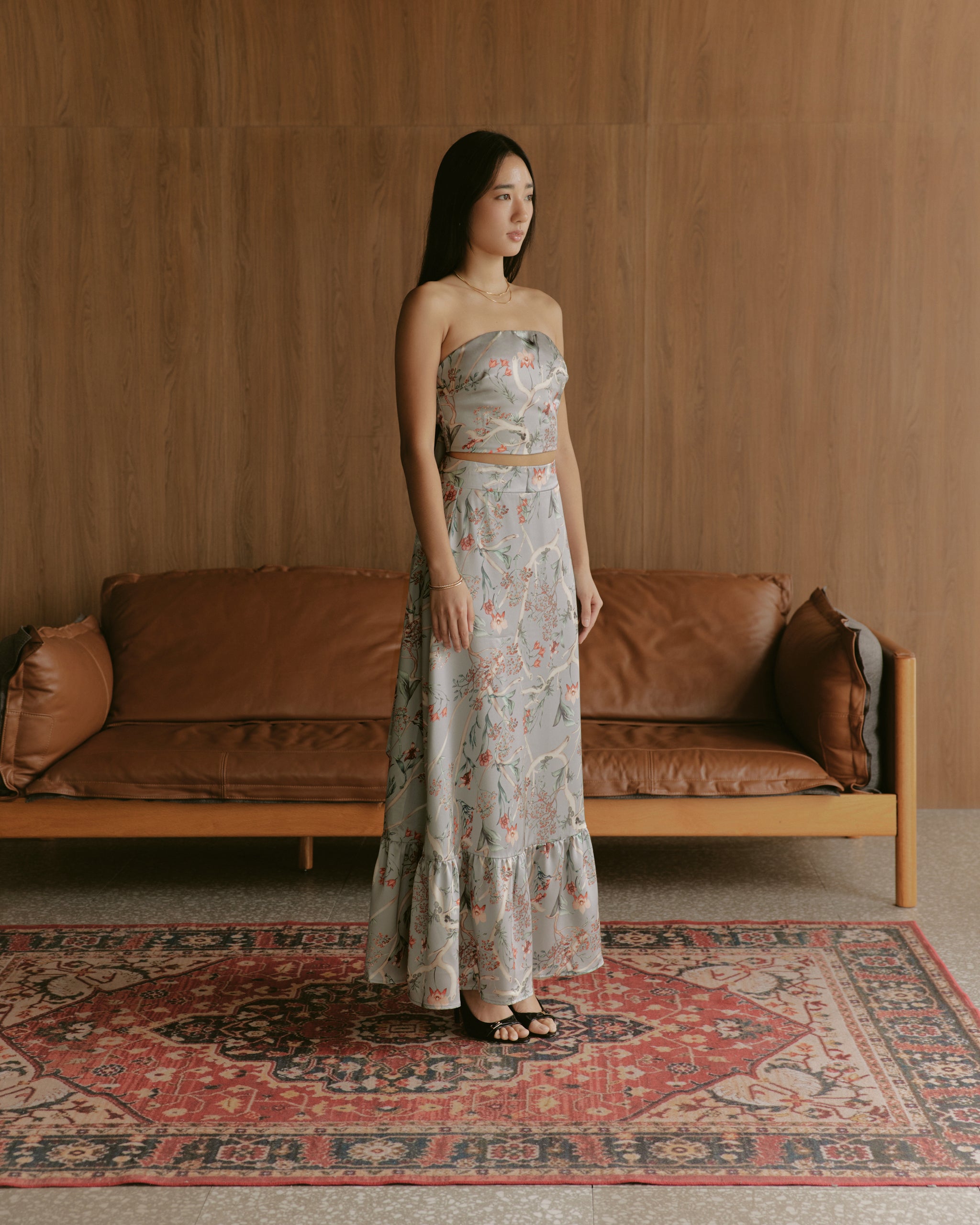 The Christina Set is a romantic ode to soft movement and quiet femininity. Crafted in a dreamy floral print, this two-piece ensemble features a strapless corset-inspired top paired with a flowing, tiered maxi skirt. The bodice is designed with a clean, rounded neckline and subtle structure, while the back reveals delicate lace-up detailing that allows for an adjustable, tailored fit. The skirt drapes effortlessly from the waist, falling into a gentle ruffle hem that moves gracefully with every step. Light, airy, and impossibly elegant, the Christina Set captures a timeless sense of ease, perfect for garden gatherings, intimate celebrations, and sunlit afternoons.