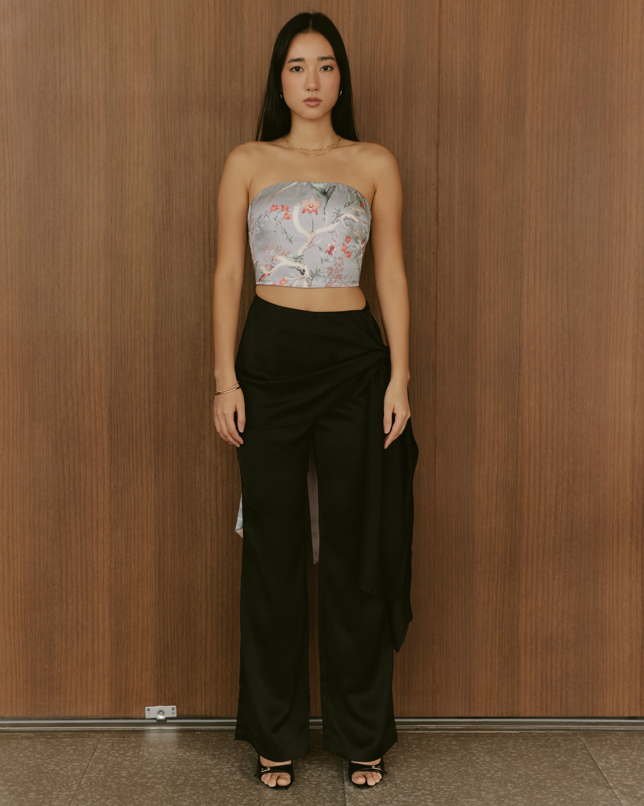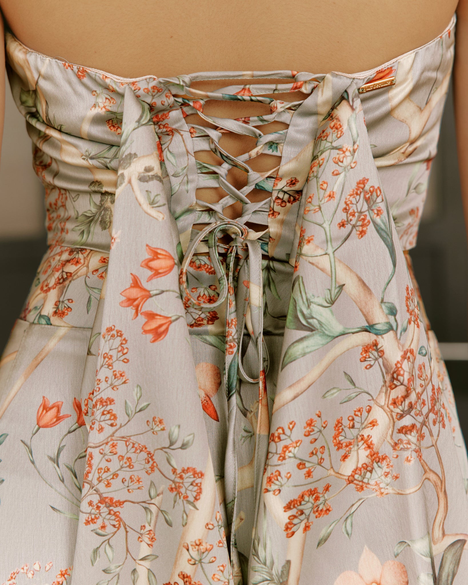 The Christina Top is a timeless blend of structure and softness. Cut in a romantic botanical print, this strapless piece features a sleek, sculpted bodice that flatters the frame while maintaining an effortless feel. The clean neckline offers a modern, minimal finish, contrasted beautifully by the lace-up back that adds both adjustability and an unexpectedly feminine touch. Light, smooth, and easy to style, the Christina Top pairs seamlessly with tailored trousers, flowing skirts, or its matching Christina Skirt for a coordinated look that feels both polished and poetic.