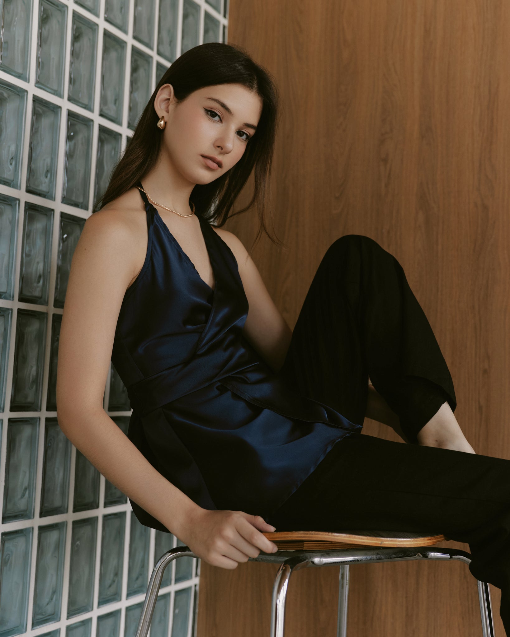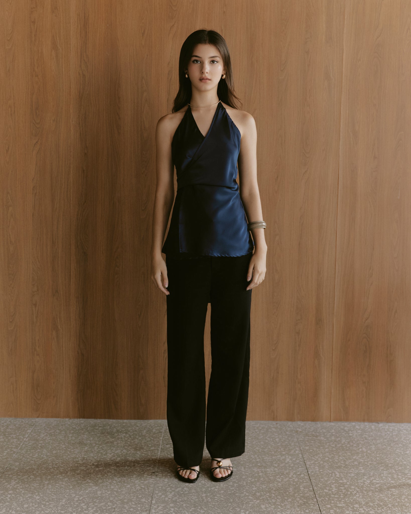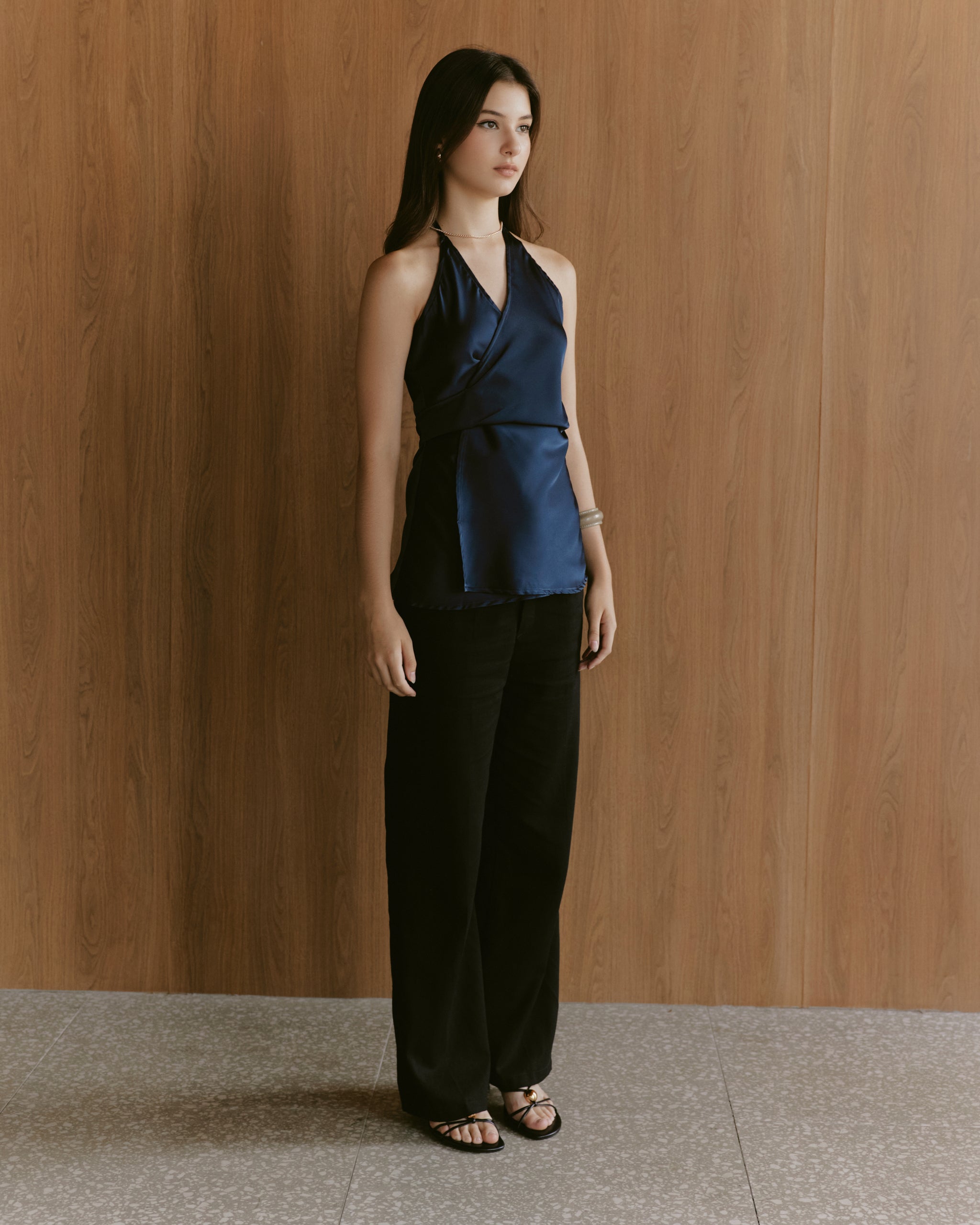 The Lauren Top is the epitome of quiet luxury, sleek, fluid, and effortlessly flattering. Crafted in a rich midnight satin, this halter-wrap silhouette softens against the skin with a gentle sheen that moves beautifully in the light. The V-shaped neckline elongates the frame, while the adjustable wrap detail cinches the waist for a feminine, sculpted fit. Finished with a clean open back and long tie closures, the Lauren Top offers versatility for both day and evening styling, whether paired with tailored trousers or its matching satin pants. A timeless piece that elevates even the simplest look.
