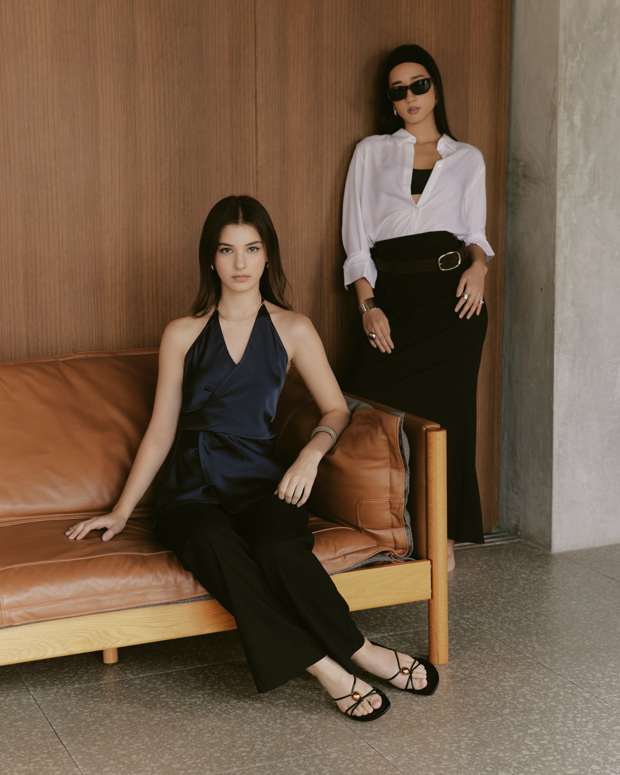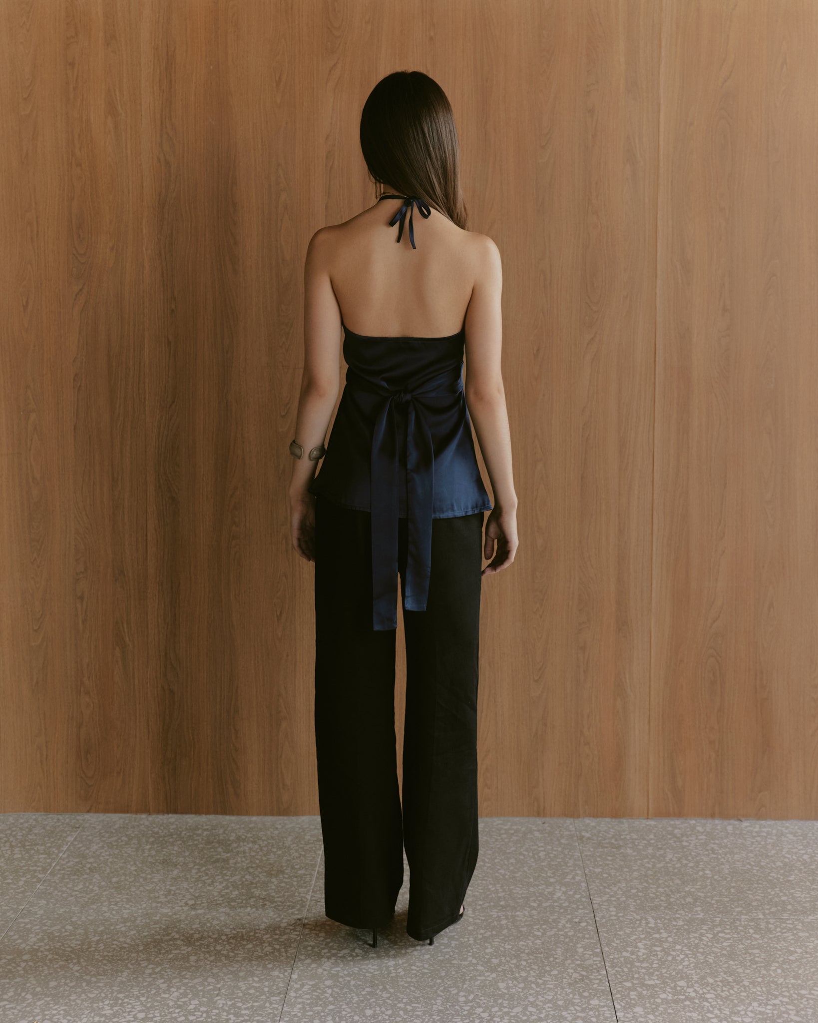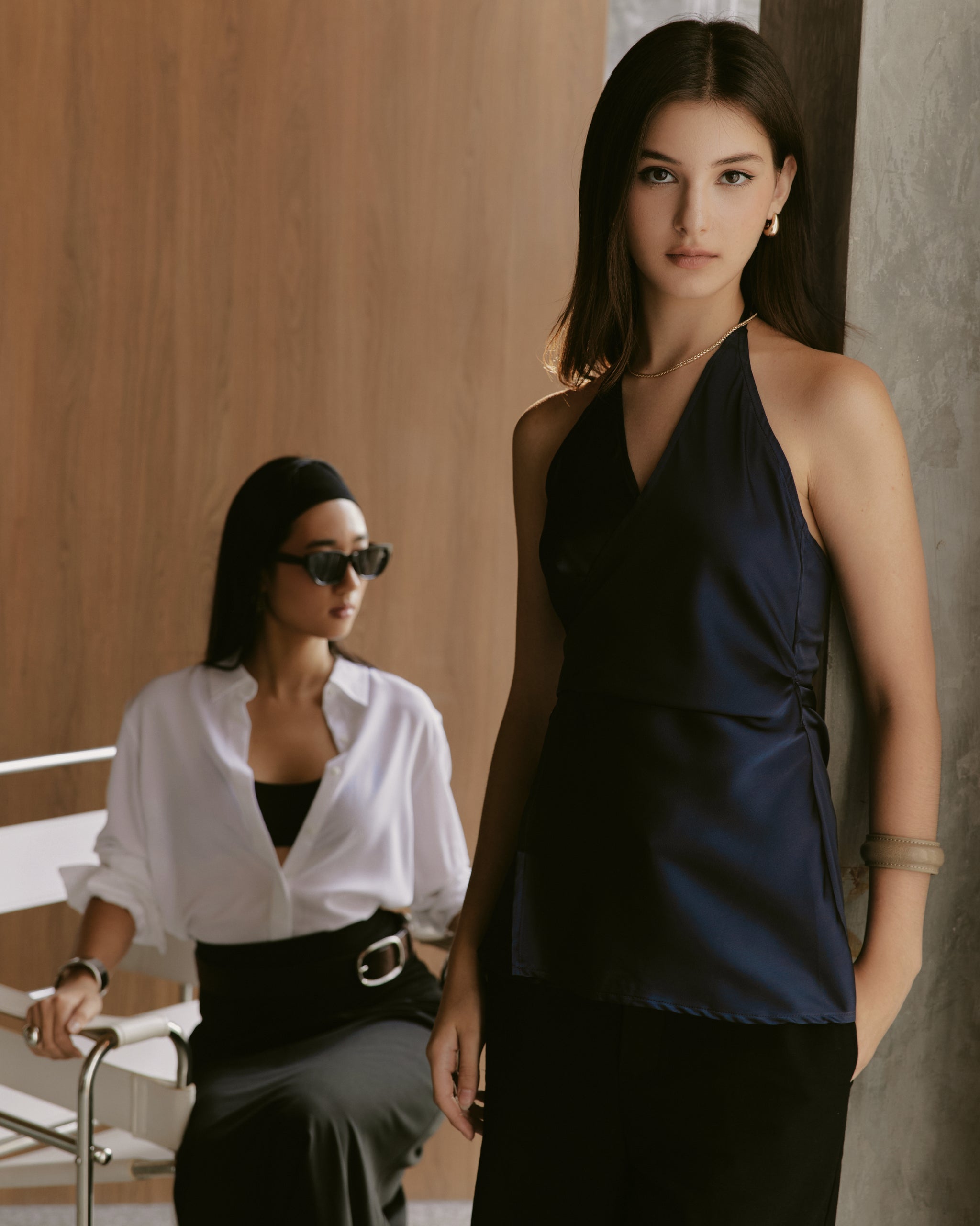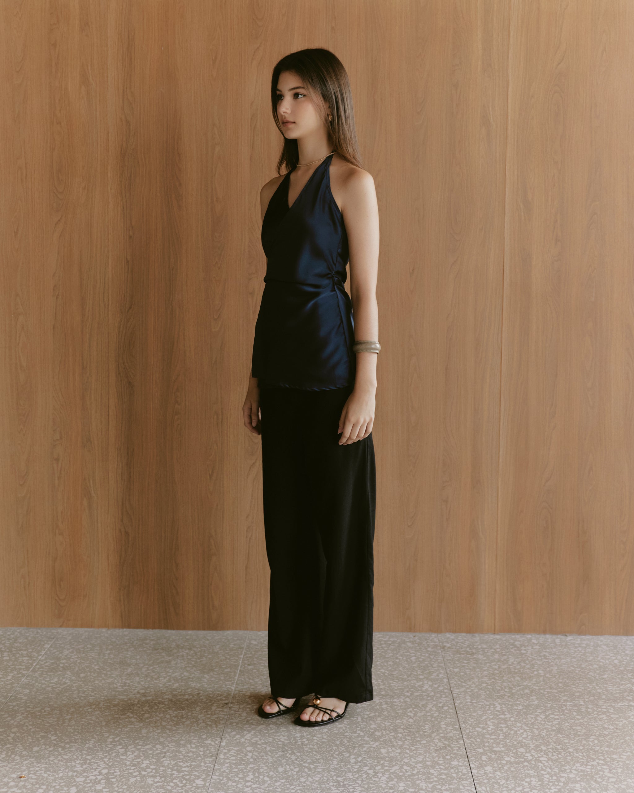 The Lauren Top is the epitome of quiet luxury, sleek, fluid, and effortlessly flattering. Crafted in a rich midnight satin, this halter-wrap silhouette softens against the skin with a gentle sheen that moves beautifully in the light. The V-shaped neckline elongates the frame, while the adjustable wrap detail cinches the waist for a feminine, sculpted fit. Finished with a clean open back and long tie closures, the Lauren Top offers versatility for both day and evening styling, whether paired with tailored trousers or its matching satin pants. A timeless piece that elevates even the simplest look.