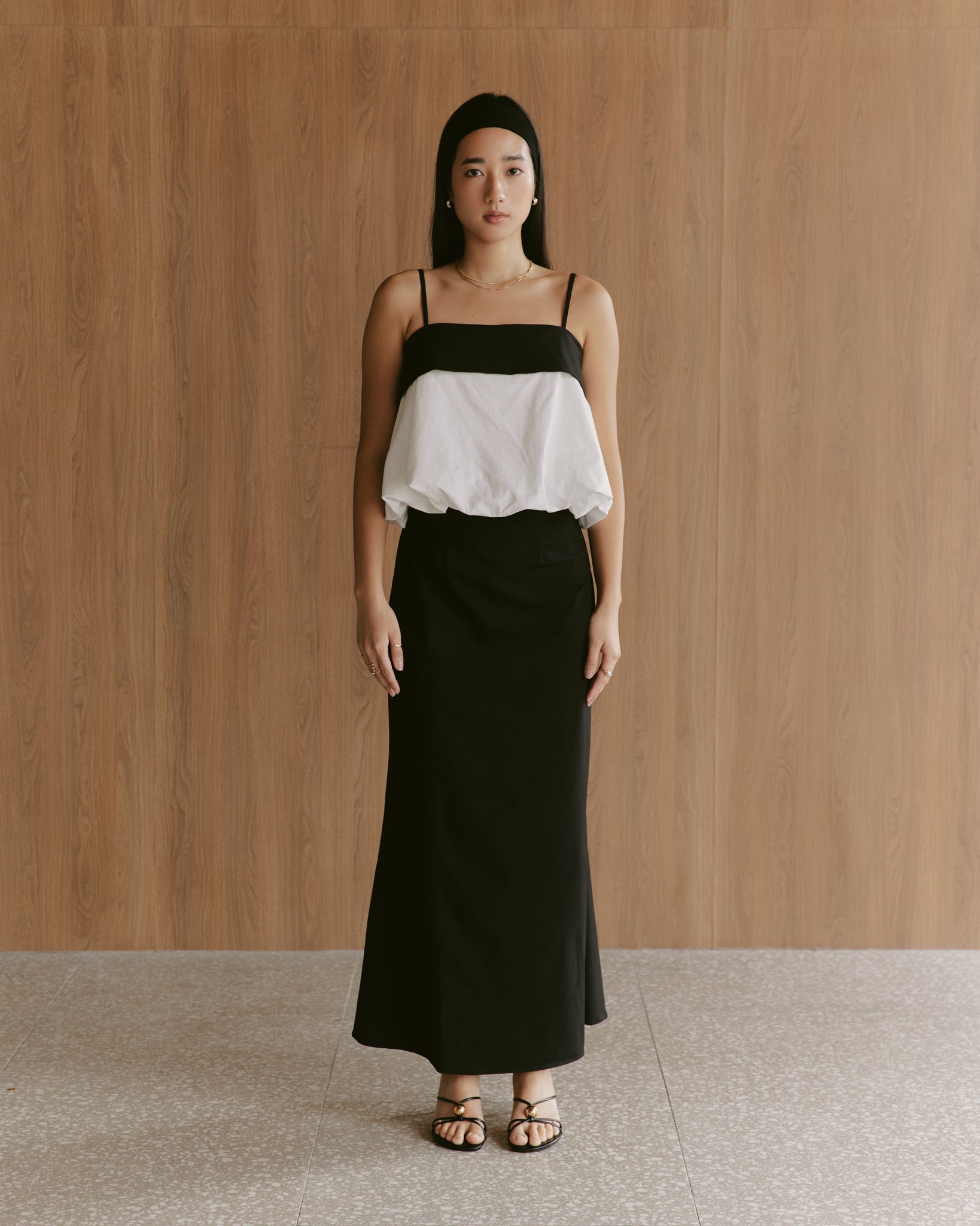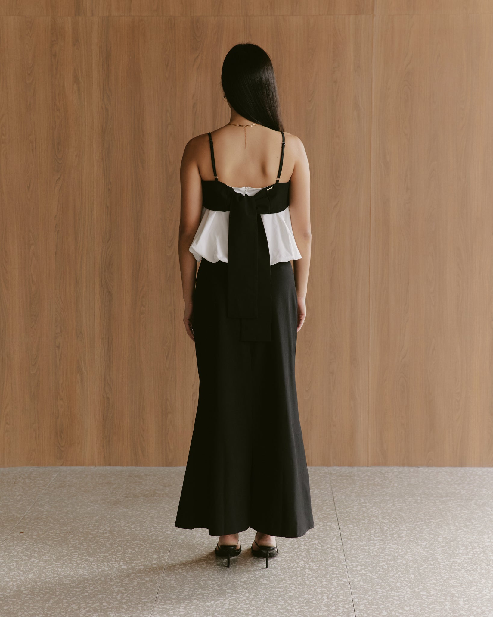 The Margo Set brings a fresh, sculptural elegance to modern dressing. Designed in a striking monochrome palette, this two-piece ensemble pairs a soft, cloud-like overlay top with a sleek, elongated skirt for a look that feels both playful and refined. The billowed white bodice floats lightly over the frame, anchored by a clean black band and slim straps, while the long skirt skims the body in a smooth, minimal silhouette. Finished with an oversized back bow for an unexpected touch of romance, the Margo Set moves effortlessly from daytime events to elevated evenings with unmistakable charm.