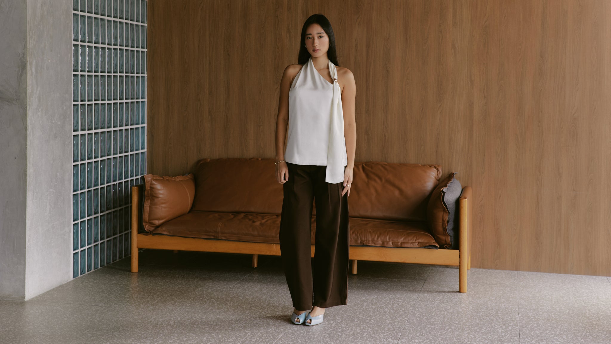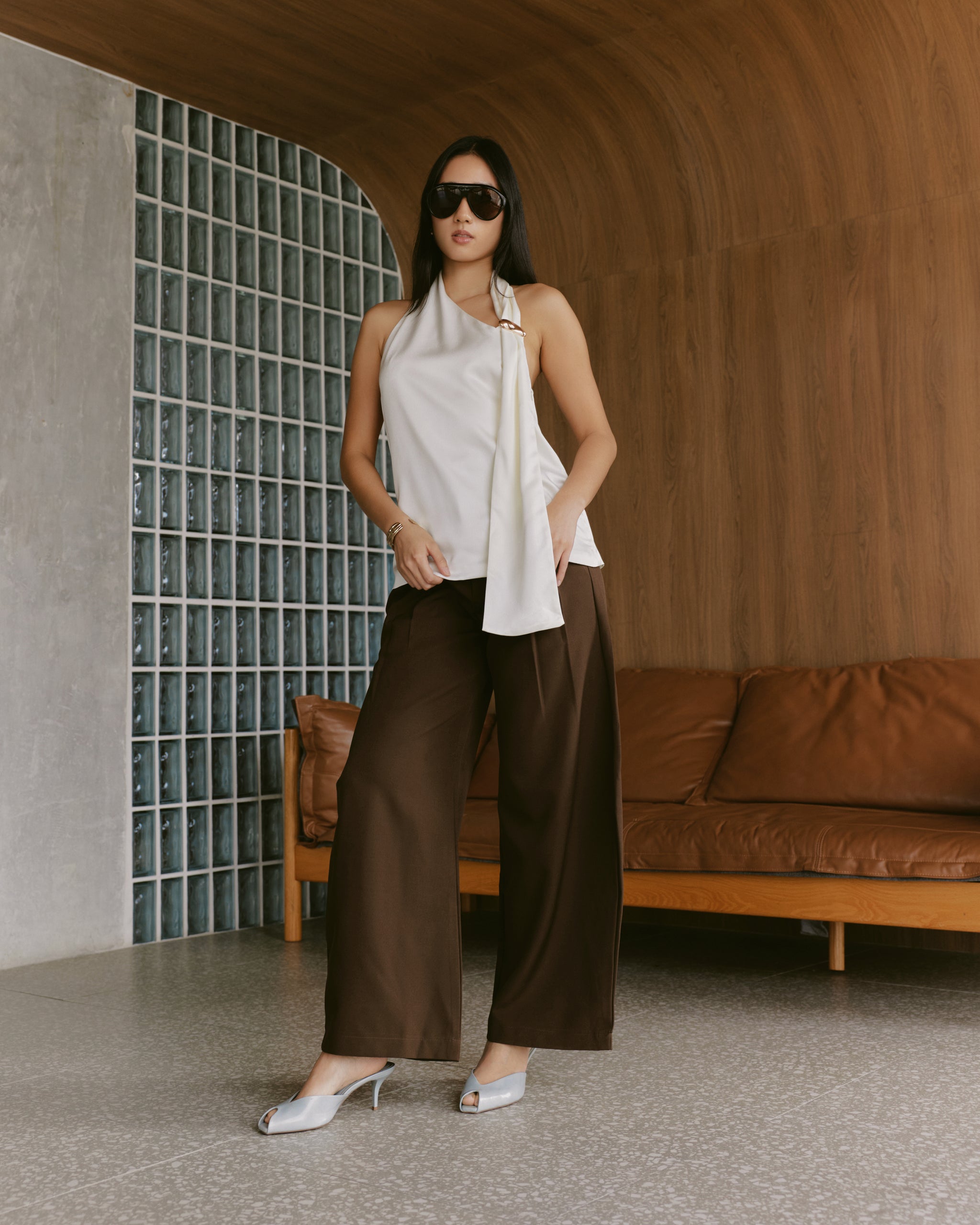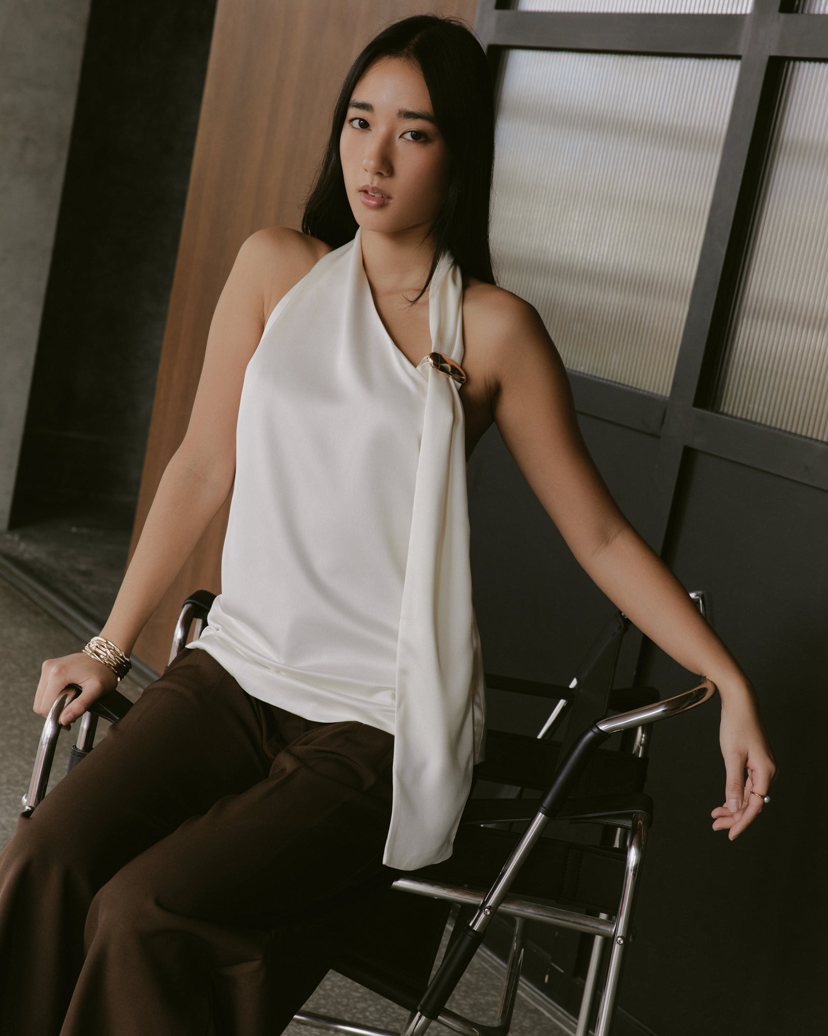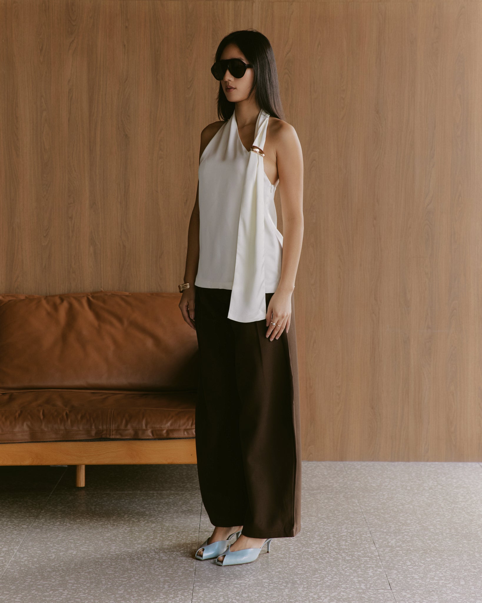 The Odette Top is understated allure refined. Crafted in a soft, fluid fabric with a luminous finish, this piece reimagines minimalism through sculptural detail. A single sweeping tie gathers gracefully at the shoulder with a polished ring accent, creating an asymmetric halter neckline that feels both modern and effortlessly feminine. The open back adds a quiet sensuality, while the relaxed drape skims the figure for a look that’s poised yet unpretentious. Paired with wide-leg trousers or worn to elevate denim, the Odette Top is a study in contemporary elegance.